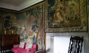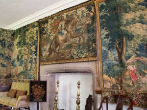 The theme is the five senses, and it’s believed that the whole sequence was an expensive wedding gift from a bridegroom for his bride. Only the most wealthy could afford tapestries. These tapestries at Cotehele House in Cornwall are seventeenth- and eighteenth-century rather than medieval, but they demonstrate the effect of being in rooms richly hung with cloth: