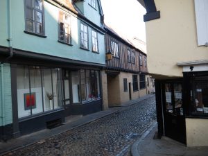 The wealthier the owner, the longer the main street frontage of the building; a long street front was a status symbol, as was decoration: this house on Elm Hill in Norwich (which you can see in the wider-angle picture above) dates from the early sixteenth century, and was owned by Austin Steward or Styward, Lord Mayor of the city at the time of Kett’s Rebellion in 1549. It was built on the site of another, fifteenth-century dwelling, the city home of Sir John Paston (of ‘Letters’ fame), who was also a Norwich alderman (top member of the city council).