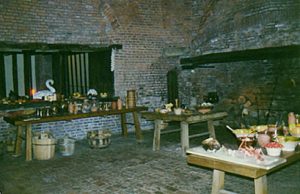 The whole has been reconfigured with modern reproductions of medieval ‘stuff’, with a fake feast in the kitchen, a pantry and a wine store. The hall’s window recess has been envisaged as a worship space, although there would probably have been a separate room for this, or a chapel. In the wall there are three entrances from the ‘screens passage’ where the servants or performers waited before being granted entrance to the hall.