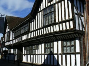 Some more examples of medieval/early Tudor to early Stuart houses (these, unlike nineteenth-century and more modern examples, are not consciously ‘medievalist’… the building of houses on timber frames with wattle-and-daub – basically woven paneling with plaster infill – continued until the second half of the seventeenth century, when stone and brick replaced it in towns):