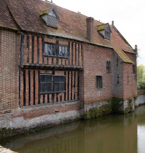 This is Kentwell Hall just outside Long Melford in Suffolk, built originally by the local lord, Sir John Clopton in the 1490s. It has been substantially remodeled by his early sixteenth-century successors, but at the side can still be found the ‘Moat House’, which dates from the fifteenth-century building. It’s the half-timbered section in these pictures (note it’s infill is brick, not wattle-and-daub):
