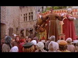 (below: a crowd scene from Hour of the Pig… the actors, including the main characters, are shown in focus in the crowd, but Megahey also wants us to focus on the actors on stage, and the ‘medieval’ setting behind. He uses deep focus in court and gallows scenes, too. Eric Rohmer’s Perceval le Gallois is filmed almost entirely in deep focus in order to preserve the ‘medieval-ness’ of the staging.)