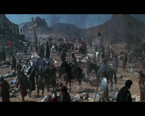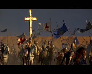 (Use of a symbol – in Ridley Scott’s Kingdom of Heaven the ‘ideal’ of power and glory that the Crusader kingdom of Jerusalem represents are symbolised by the great golden cross carried before the king (although the idol has feet of clay, as Baldwin is a leper who hides his face behind a silver mask). Still golden but in retreat, the defeated knights flee Saladin’s army with the cross that now represents the final hope that they cling to. The wooden, tarnished cross is carried off by Saladin’s army, it’s gold plating removed to show its tawdry fragility; an obvious metaphor for the Latin kingdom. In the penultimate scenes of the film, the cross is taken down from the top of the basilica and replaced with an Islamic crescent. Symbolism gives a strong theme and structure to the film as a whole, with these scenes reminding the audience of the film’s ‘spine’.)