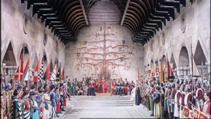 (Group shots – Anthony Mann has the camera move from a high-angle panorama where it ‘flies’ along at roof height, from where it is then lowered to face the Castilian royal family head on. The genealogical tree painted on the wall behind them is a master stroke by this wonderful director of epic – they are rooted in their family history, and entrapped by it. The film that follows [El Cid] will have ‘family’ as its major theme. In Game of Thrones we meet the Starks in a line, filmed from a slightly lowered angle… they fit into their landscape and are also closely bound… lacking a rich historical background, the camera and the actors have to do the ‘heavy lifting’. It doesn’t work so well…the characters are less closely bound by their lineage; their ties are more personal and the family won’t hold so closely together).