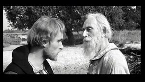(below: Andrei and Theophanes the philosopher – who isn’t really there, because he died a long time before – debate… the story of their differences of opinion don’t need words in Tarkovsky’s narrative frames. From Andrei Rublev; in this film about Russia’s famous icon painter, almost every scene is its own little icon.)